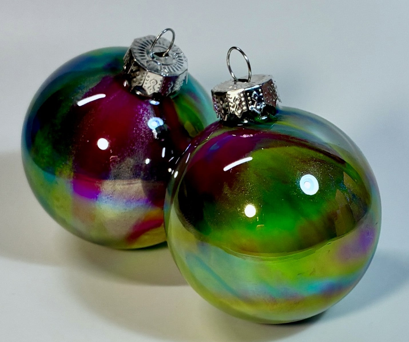 This exquisite handmade glass bauble showcases a mesmerising acrylic pour fluid art technique, creating an entirely unique design that won't be replicated. The iridescent surface captures light beautifully, revealing shifting hues of dark blue, cerise, teal, and green accented with silver metallic swirls. Part of an exclusive pair, each bauble is individually crafted, making it a distinctive addition to any collection. Perfect for those seeking bespoke, artisanal Christmas décor that celebrates contemporary fluid art aesthetics.