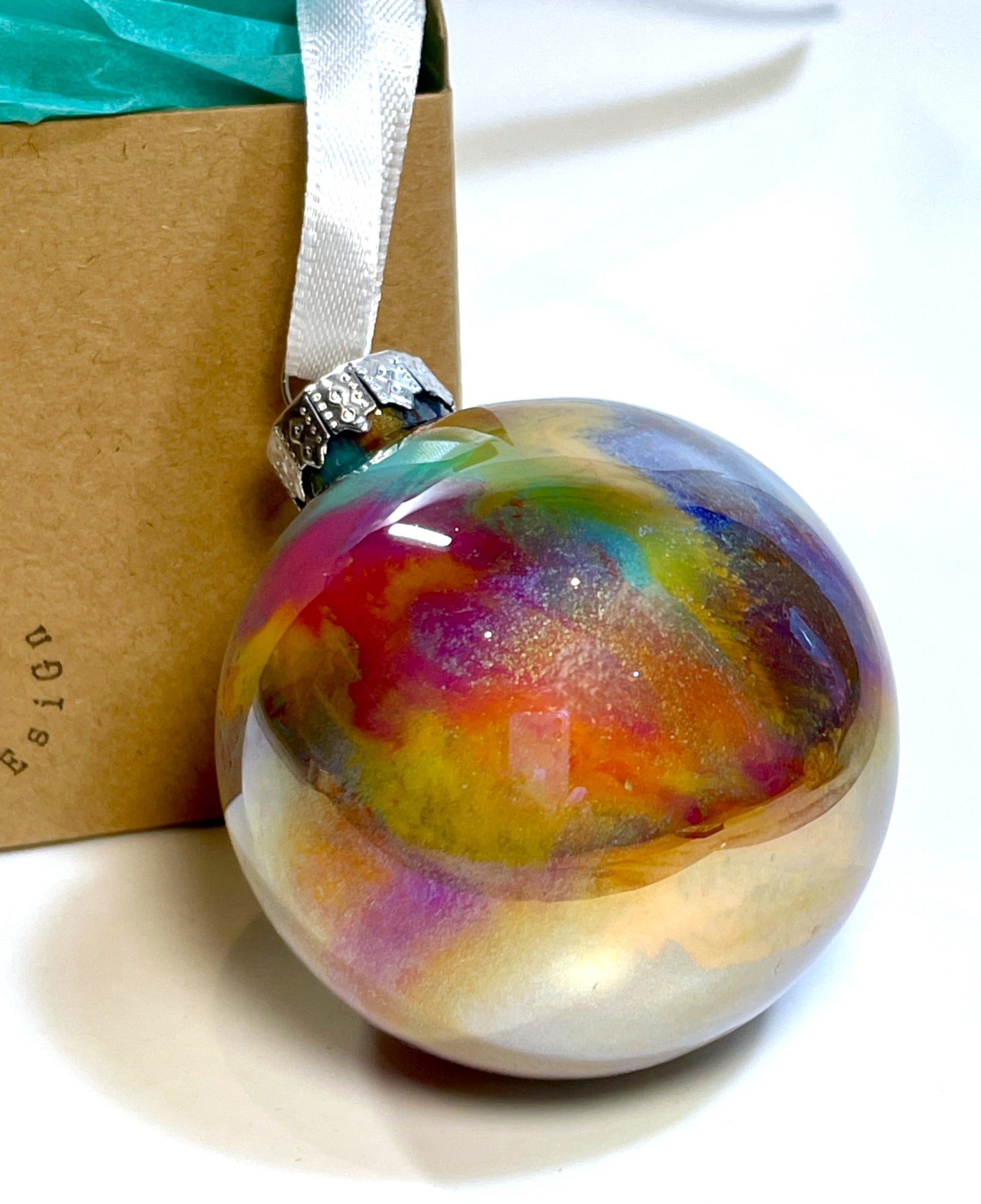 Elevate your holiday decor with this hand-painted glass Christmas bauble featuring a masterful acrylic pour design. The unique blend of purple, turquoise, orange, yellow orche, and silver tones creates an iridescent effect that captures light beautifully. Each bauble is a one-of-a-kind piece, combining artisanal craftsmanship with vibrant colors to add a sophisticated and artistic touch to your festive celebrations. Perfect for collectors or as a distinctive gift, it brings elegance and originality to any Christmas tree.