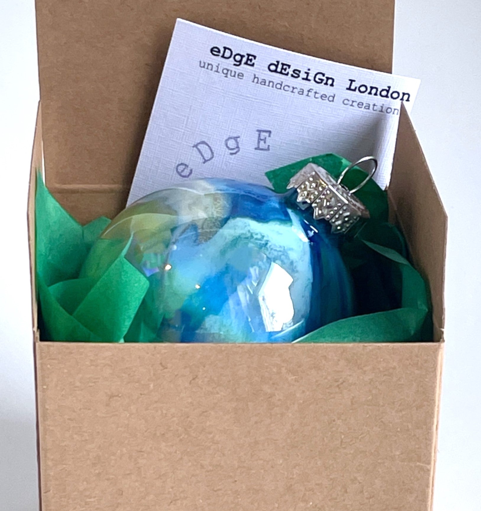 This hand-painted glass Christmas bauble features a distinctive acrylic pour design in dark blue, light blue, green, and rose gold with an iridescent finish that reflects light beautifully. Each bauble is one of a pair, making it a unique and elegant addition to your holiday decorations. For the complementary piece, see EJ25B060.